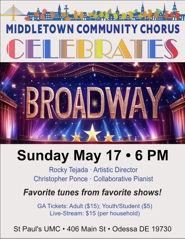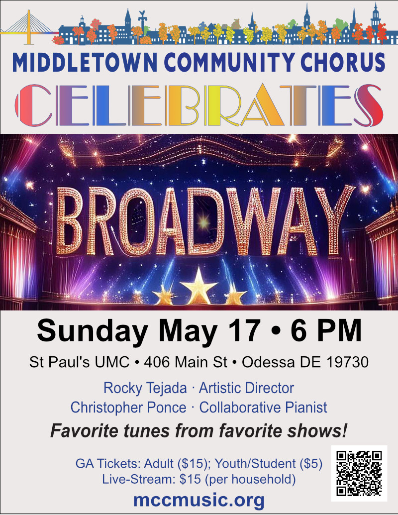 Join us for MCC Celebrates Broadway on Sunday May 17th at 6pm at St Paul’s UMC in Odessa. Our concert will feature choral arrangements of songs from Phantom of the Opera, Company, Godspell, Something Rotten, Thoroughly Modern Millie, Les Miserables, and many other shows. We will also include MCC members singing their favorite songs from their favorite shows.